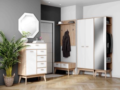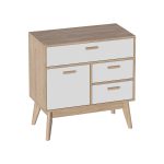Небольшие размеры позволяют разместить этот интерьерный предмет как в компактной прихожей, так и в любом другом помещении. Корпус комода выполнен из ЛДСП цвета натурального дуба, фасады — из белоснежного матового МДФ. Высокие опоры из массива березы облегчают уборку и делают комод легким в интерьере. Ручки выполнены из массива березы.