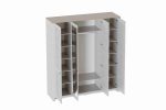 УФ-фотопечать полосок на фасадах в обрамлении пластиковых молдингов придает изделию оригинальный стиль современной классики. В центральной части шкафа расположена штанга для одежды, а также верхняя и нижняя полки, каждая из которых разделена на два отделения. Правая и левая части шкафа имеют по пять полок высотой 332 мм каждая. Задняя стенка шкафа изготовлена из ХДФ. На опорах размещены войлочные подпятники. Высота опор 104 мм. Зеркало выполнено с фацетом.