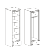 В шкафу расположены распашная дверь и ящик на шариковых направляющих глубиной 500 мм. Дверь монтируется как на левую, так и на правую сторону изделия. За распашной дверью Вы можете расположить либо четыре съемные полки, либо полку и стальную штангу по своему желанию.