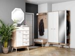 Справа от зеркала, фасад украшен белоснежной планкой из МДФ. Корпус шкафа выполнен из ЛДСП цвета натурального дерева, высокие стильные опоры — из массива березы. Шкаф идеально сочетается с шкафом «Калгари» двухстворчатым для прихожей, всеми комодами «Калгари», а также тумбой для прихожей «Калгари» с двумя ящиками и с вешалкой «Калгари».