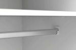 Шкаф трехстворчатый «Соната» с непроходными стенками будет одинаково гармонично смотреться как в составе мебельной композиции, так и установленный отдельно. В левой верхней части шкафа находятся две стационарные полки со штангой для одежды, правая верхняя часть представляет собой две стационарные и три съемные полки. Нижняя секция оборудована тремя выдвижными ящиками с фасадами, декорированными прорезными ручками, в которых можно хранить предметы, имеющие более утилитарное назначение.
