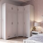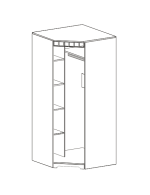 В угловом шкафу за распашной дверью расположены платяное отделение со стальной штангой и полкой сверху, и отделение с полками в количестве 4 шт. Дверь монтируется на любую сторону шкафа.