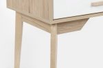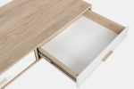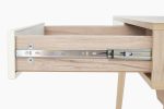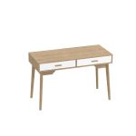 Столешница и корпус изделия выполнены из ЛДСП цвета натурального дуба, фасады ящиков — из МДФ, ручки — массив березы.