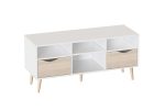 Тумба под ТВ «Соната» сформирует композиционный центр ТВ-зоны и позволит сохранить больше свободного пространства в гостиной. На поверхности модуля можно расположить телевизор с диагональю до 55-60 дюймов. Упорядочить хранение сопутствующих аксессуаров и компонентов домашнего кинотеатра помогут выдвижные ящики с фасадами, декорированными вырезными ручками в цвете «Дуб Сонома», и открытые ниши.