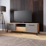 Тумба ТВ для гостинной с открытой полкой и створками. Лаконичный стильный дизайн впишется в любой интерьер. Максимальная распределенная нагрузка на верхнюю крышку тумбы — не более 15 кг Цвета, материалы: корпус ЛДСП Дуб Крафт Золотой фасад ЛДСП Графит Серый Тип петель: без доводчика «Boyard» / «Marshall» Направляющие: металлические, роликовые «Boyard» / «Marshall» Лицевая фурнитура: опора из ABS-пластика, цвет Черный ручка пластиковая, цвет Черный на ящике лицевая фурнитура отсутствует Размеры: высота — 50 см ширина — 160 см глубина — 47,5 см