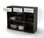 — Три ящика: Комод имеет три выдвижных ящика, которые обеспечивают удобное хранение вещей. Ящики легко открываются и закрываются благодаря прочным механизмам.